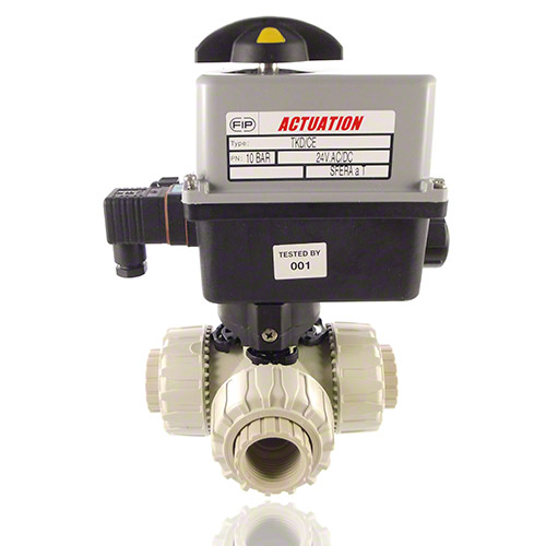 | 3/2-Wege-Kugelhahn aus PP mit elektrischem Stellantrieb mit Endlagenrückmeldern, Handnotbetätigung und optischer Stellungsanzeige Kugel mit L-Bohrung Standardkugelstellung: 1 Stellantriebsdaten: Standard 90-240V / 50-60Hz (AC) ohne Aufpreis 24V AC/DC Andere Spannungen auf Anfrage Anschluss: Gewindemuffe Dichtung: PTFE/EPDM |