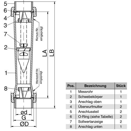 | - Messkonus: Polysulfon, Temperaturbereich 0 -100 °C * - * Temperaturwerte gelten für Wasser - Messkonuslänge: 165 mm / 170 mm - Schwebekörper: PP mit Magnet - Dichtung: EPDM (Standard), FPM auf Anfrage - Anschluss: Armaturenverschraubung mit Einlegeteil DIN (Muffe), Einlegeteil PVC-U, Überwurfmutter PP - Genauigkeitsklasse: 4 nach VDE/VDI 3513, Blatt 2, d.h. ± 1% vom Endwert und ± 3% vom Messwert. - Standardausführung: Skala in l/h (ab DN 50 in m³/h), Wasser +20°C - Sonderskalen und Zubehör wie z.B. Grenzwertgeber auf Anfrage |