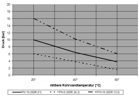 PVC-U ist im Temperaturbereich von 0 °C bis +60 °C einsetzbar. Oberhalb von +60°C erweicht PVC-U relativ schnell. Unterhalb von 0°C nimmt die Schlagzähigkeit stark ab, so dass Akatherm FIP den Einsatz von PVC-U in diesen Bereichen nicht empfiehlt. Bezüglich der Innendruckbelastbarkeit von Rohren und Formteilen verweisen wir auf das vorstehende Druck-Temperaturdiagramm.