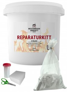 Das Reparaturset enthält neben den 6 Beuteln Bindemittel auch 1 Messbecher, 1 Schere und 1 Schwamm zum Auftragen und Verblenden.
